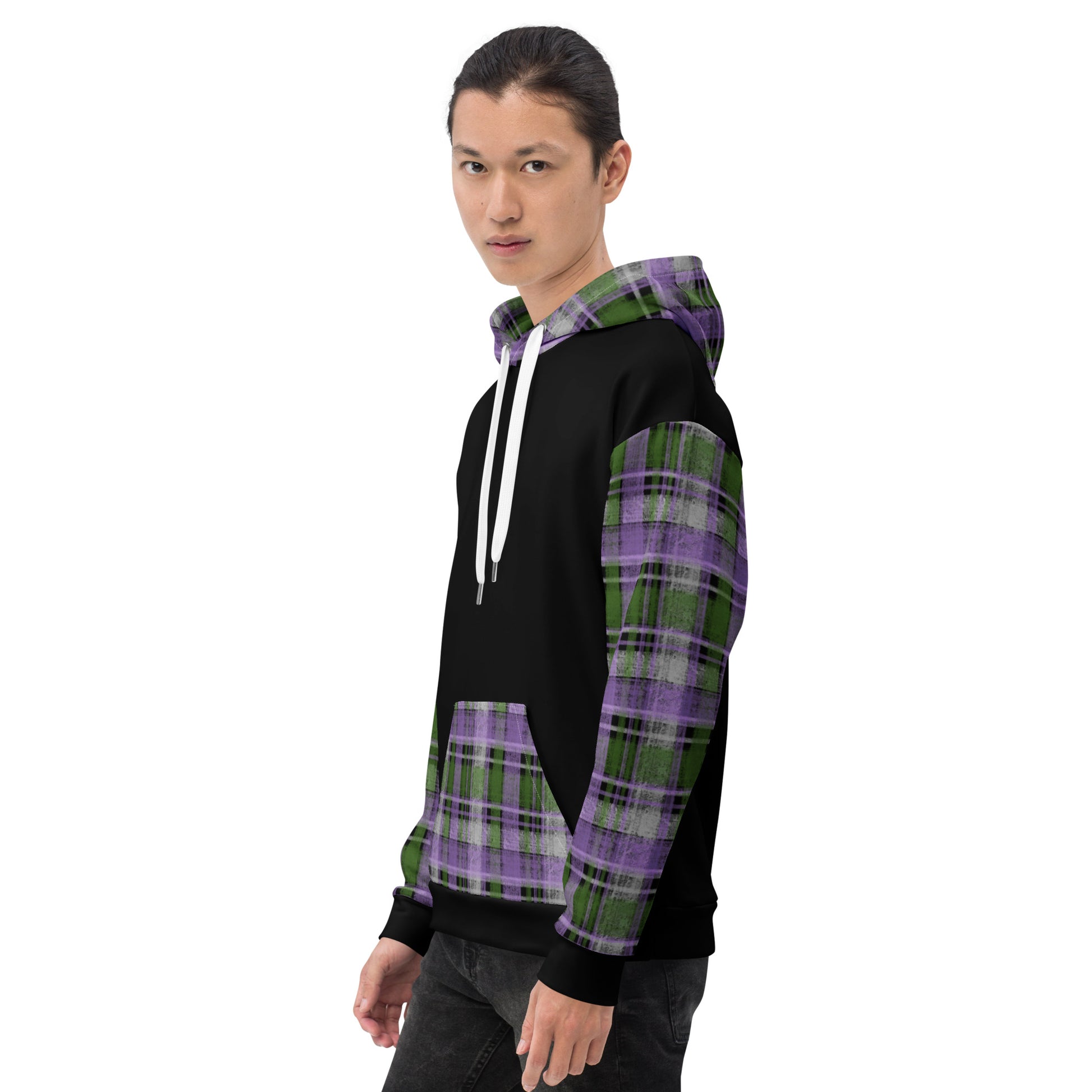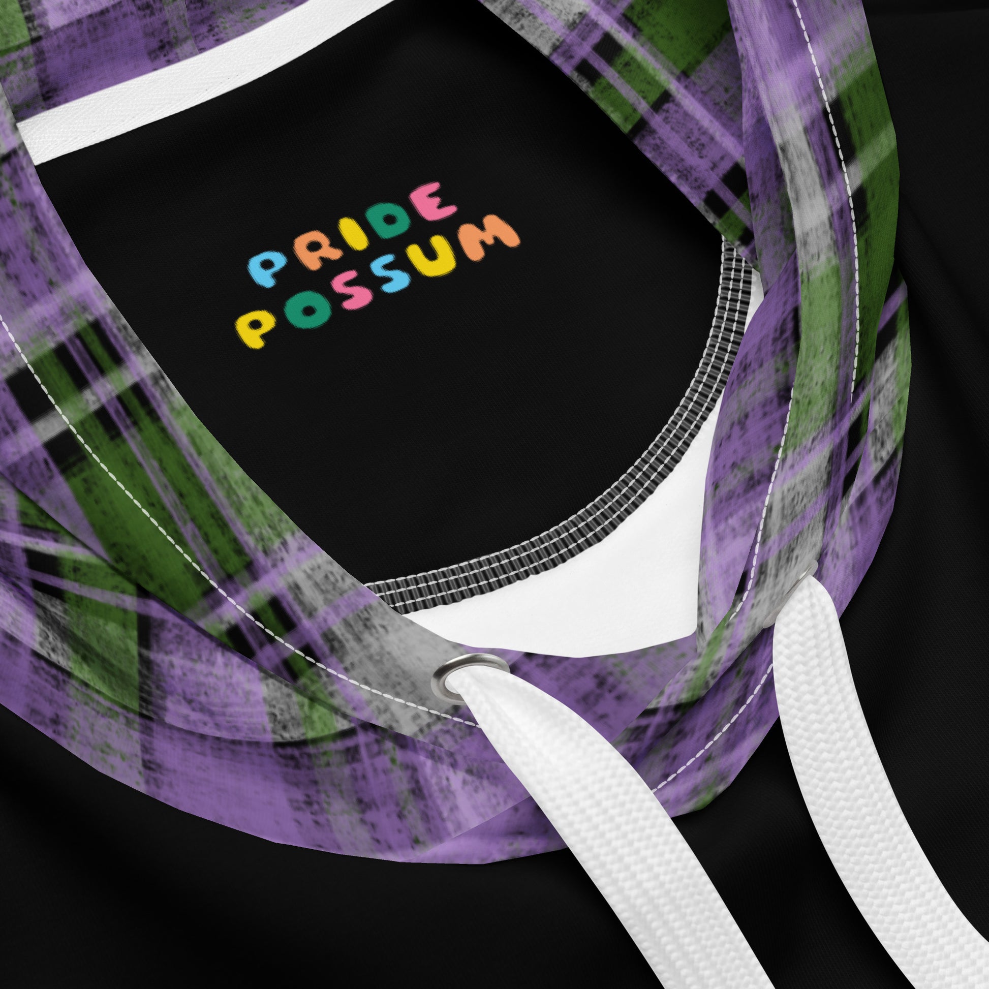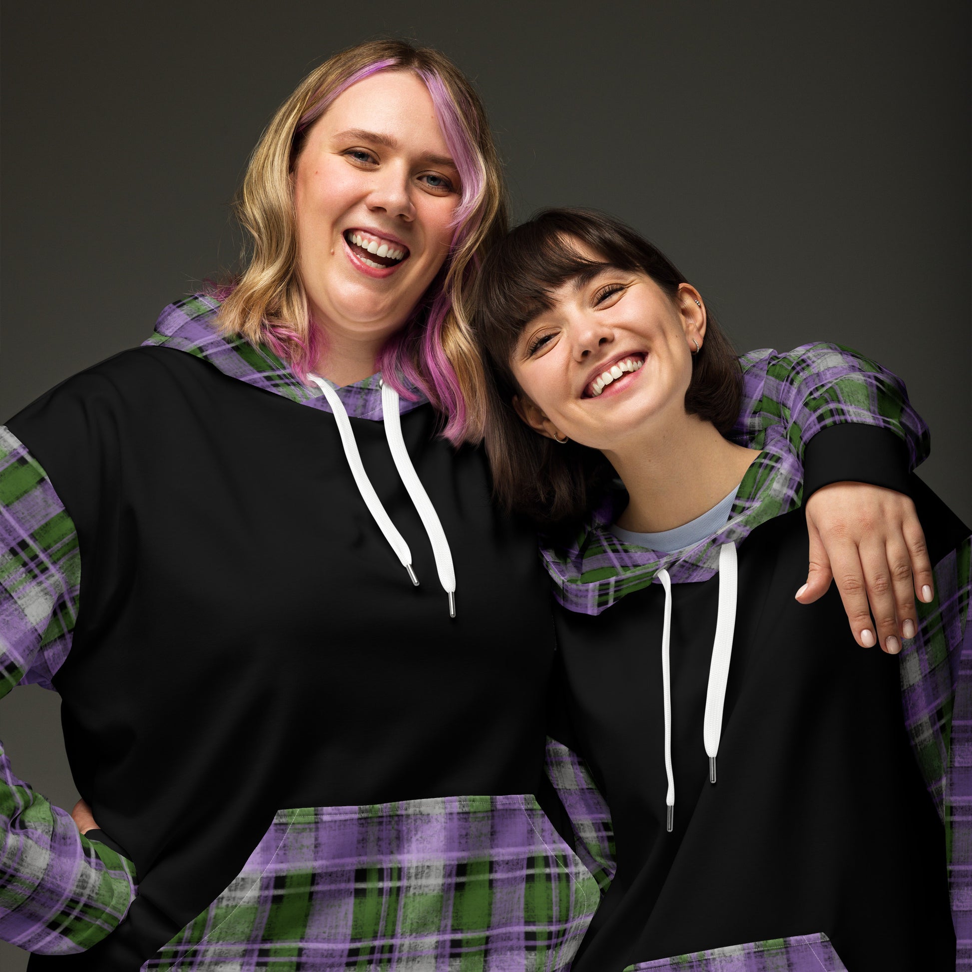Soft, expressive, and unapologetically you. This unisex hoodie features a custom plaid pattern inspired by the lavender, white, and green stripes of the genderqueer pride flag — a cozy, elevated design that brings quiet confidence and bold identity together in one perfect layer.