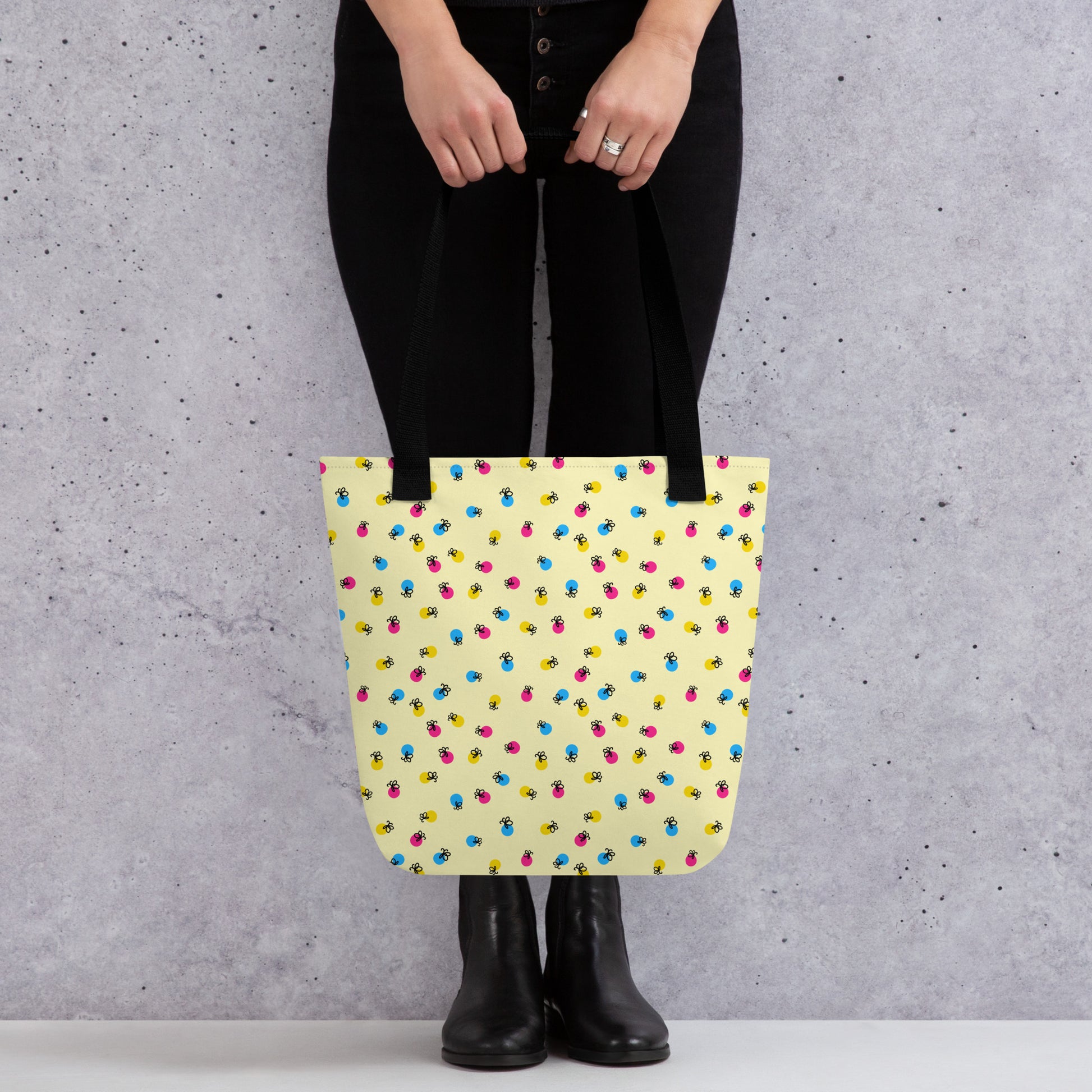 Light up your look with pride. This spacious all-over print tote bag features a glowing firefly design in the pink, yellow, and blue colors of the pansexual pride flag — a radiant celebration of love and connection beyond boundaries.
