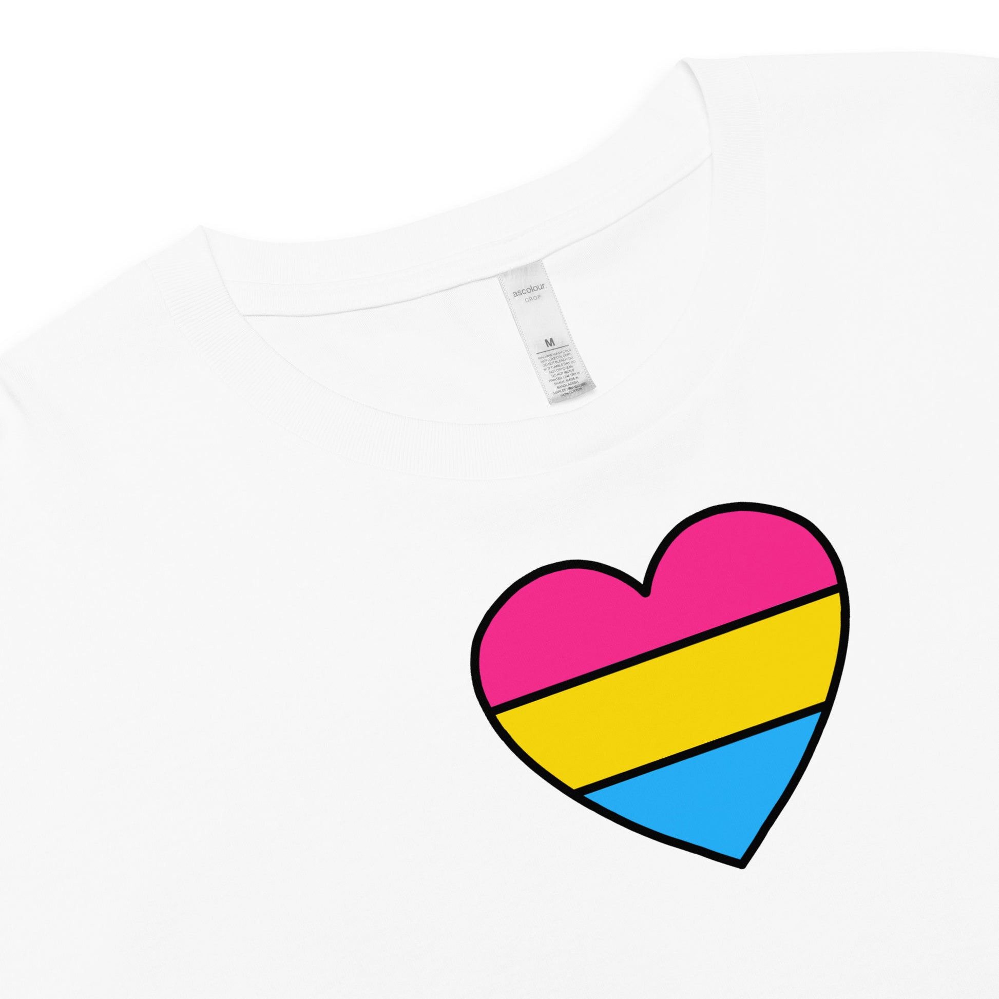 Bright, bold, and beautifully you. This white crop top features a heart graphic in the pink, yellow, and blue colors of the pansexual pride flag — a joyful celebration of love without limits.