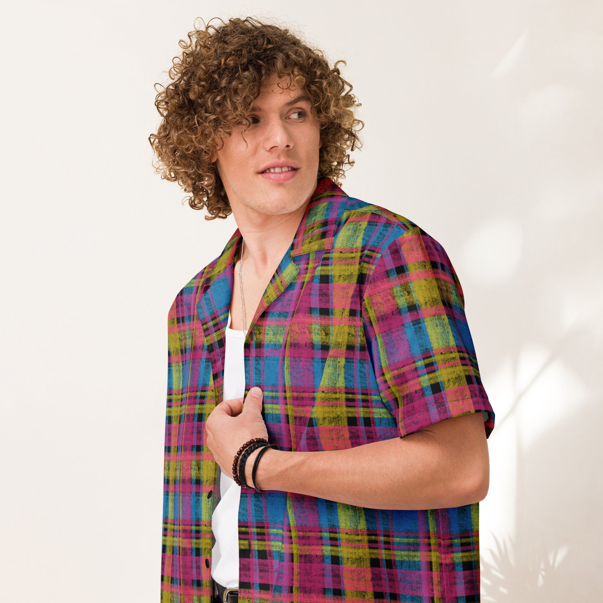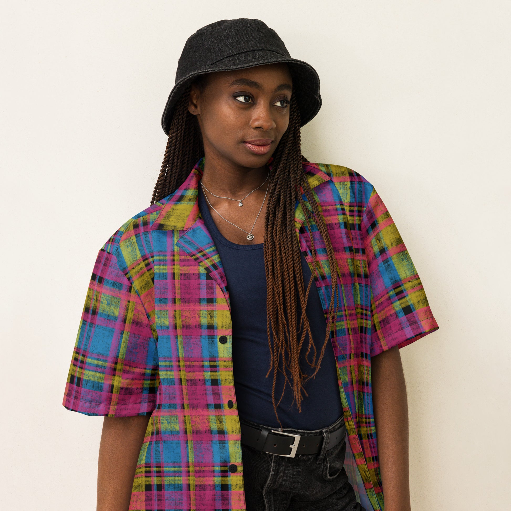 Bright, bold, and beautifully pan. This unisex button-down features a custom plaid pattern inspired by the pink, yellow, and blue stripes of the pansexual pride flag — a look that’s playful yet refined, perfect for anyone who loves a subtle nod to their pride. It’s smooth, breathable, and designed to look and feel amazing no matter the occasion.