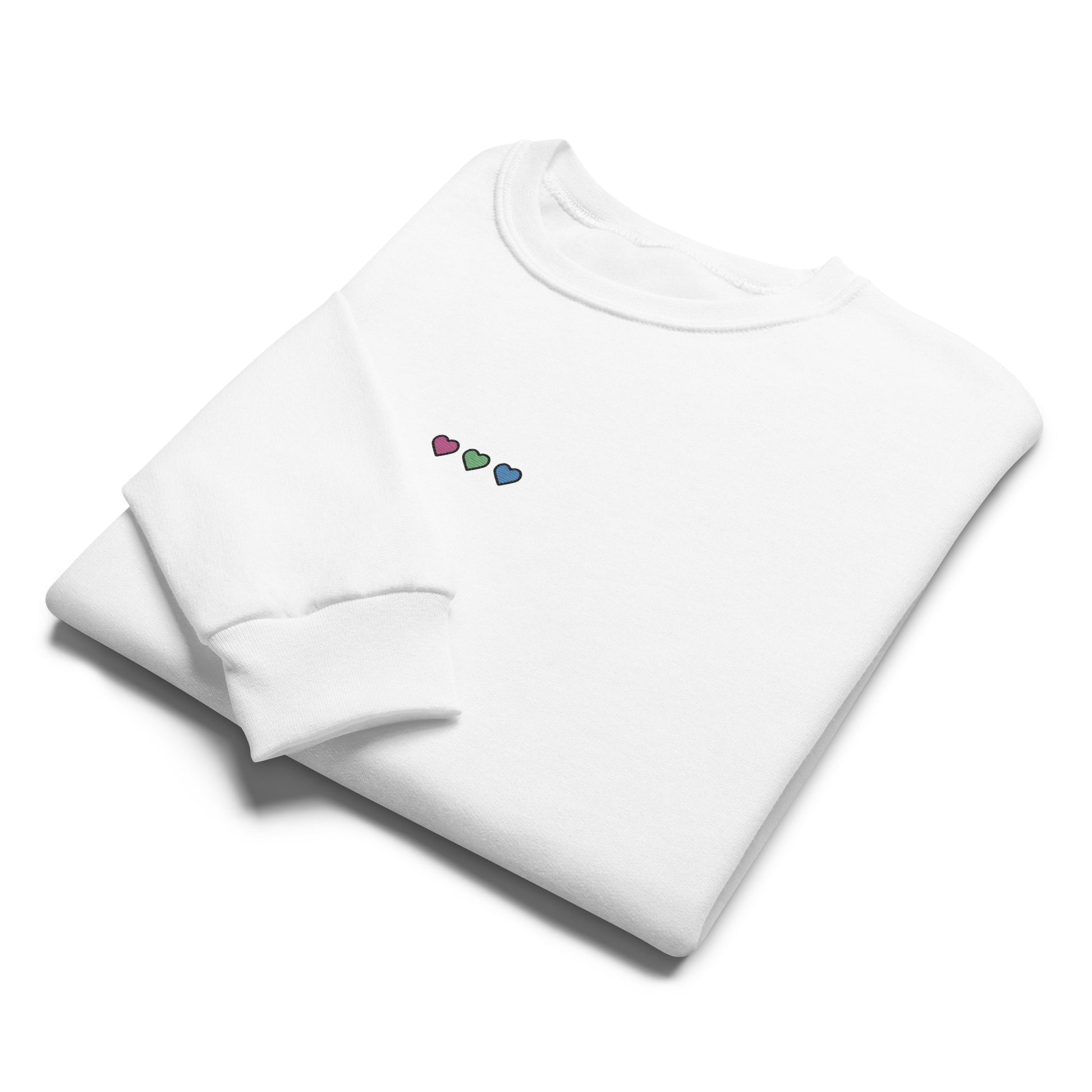 Bright, comfy, and full of pride. This soft crewneck features a small row of embroidered hearts in the pink, green, and blue stripes of the polysexual pride flag — a subtle yet vibrant nod to love and identity.