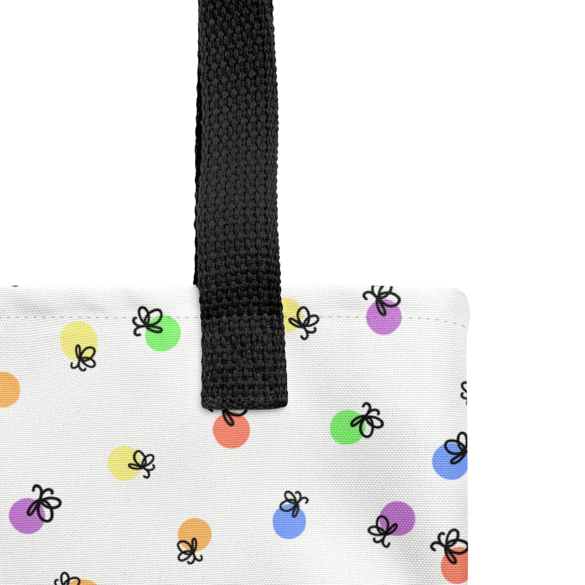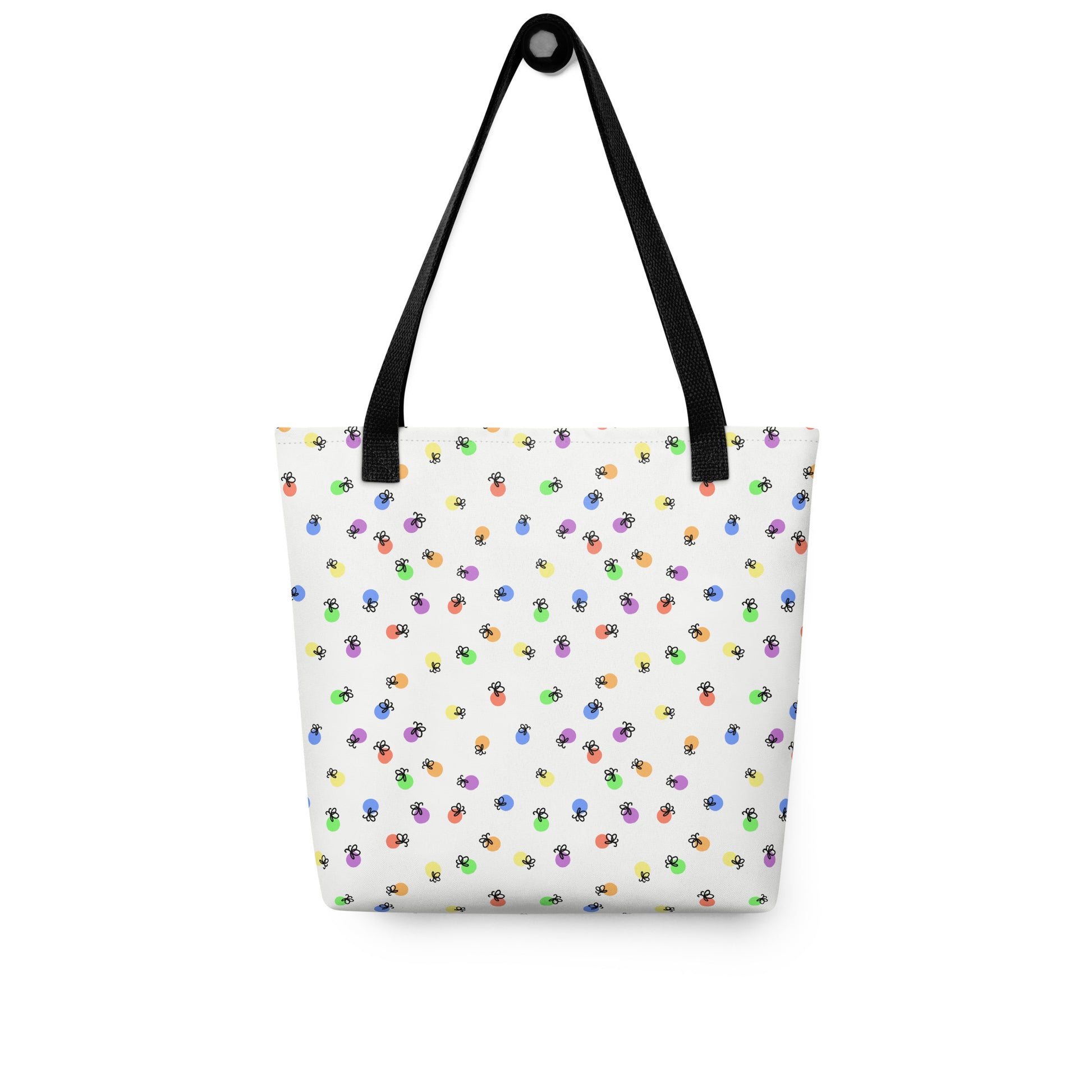 Carry your pride in full color. This spacious all-over print tote bag features a glowing firefly design inspired by the rainbow pride flag — a bright, joyful symbol of unity, love, and self-expression.